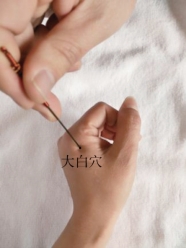 【操作】拳手取穴(拇指弯曲,抵食指第1节握拳),用1寸毫针,针深4~6分治坐骨神经痛,用三棱针刺血治疗小儿气喘、发高烧及急性肺炎(特效)。