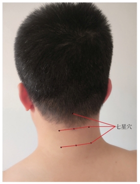 【准确取穴】在头部,于后脑高骨(枕外隆凸的上缘)凹陷中取第一穴,然后再向上量8分取第二穴。